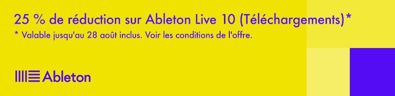 L'offre intitulée Vente Flash Ableton est très simple. Vous bénéficiez d'une réduction particulièrement intéressante sur les versions ESD d'Ableton Live 10 (donc proposées en téléchargement). L'offre concerne toutes les versions ESD Ableton Live 10, c'est-à-dire Suite, Standard et Intro, et toutes les mises à niveau ESD Live 10. Par contre, cette offre n'est pas valable sur les logiciels Live livrés dans une boîte, les versions éducatives de Live et les contrôleurs Push. Cette offre pourrait donc être le bon moment de vous intéresser à deux nouveaux packs proposés à prix avantageux : Push 2 avec Live 10 Suite (mise à niveau depuis Live Intro) et Push 2 avec Live 10 Standard (mise à niveau depuis Live Intro).
