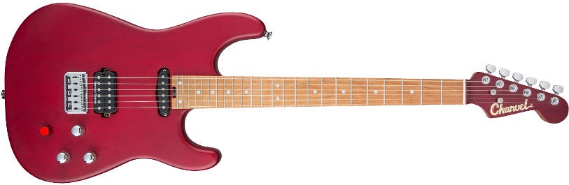 Justin Aufdemkampe, guitariste de Miss May I, sait exactement quelle sonorité tirer de son instrument, à savoir un son serré et brutal. C'est pourquoi son modèle signature, conçu en collaboration avec Charvel, est équipé de Seymour Duncan Distorsion et d'un chevalet fixe. Pour rajouter un peu de classe à l'ensemble, le guitariste a choisi une finition Trans Red particulièrement élégante.