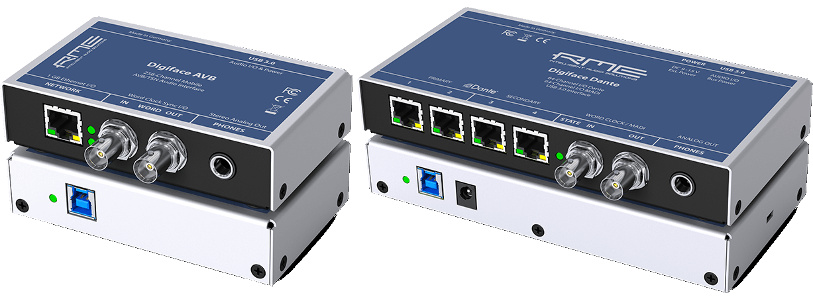 Digiface AVBComme son nom l'indique, ce modèle est destiné aux applications AVB (Audio Video Bridge). La Digiface AVB est dotée d'un port USB-3 qui permet non seulement d'alimenter l'interface, mais aussi de transporter jusqu'à 256 canaux audio ! Digiface DanteComme chez l'AVB, le port USB-3 est ici aussi de la partie pour l'alimentation et le transport d'un maximum de 64 canaux MADI. La Digiface Dante peut également être utilisée en autonome. Alimentées par bus, les deux interfaces ne nécessitent aucune alimentation externe !