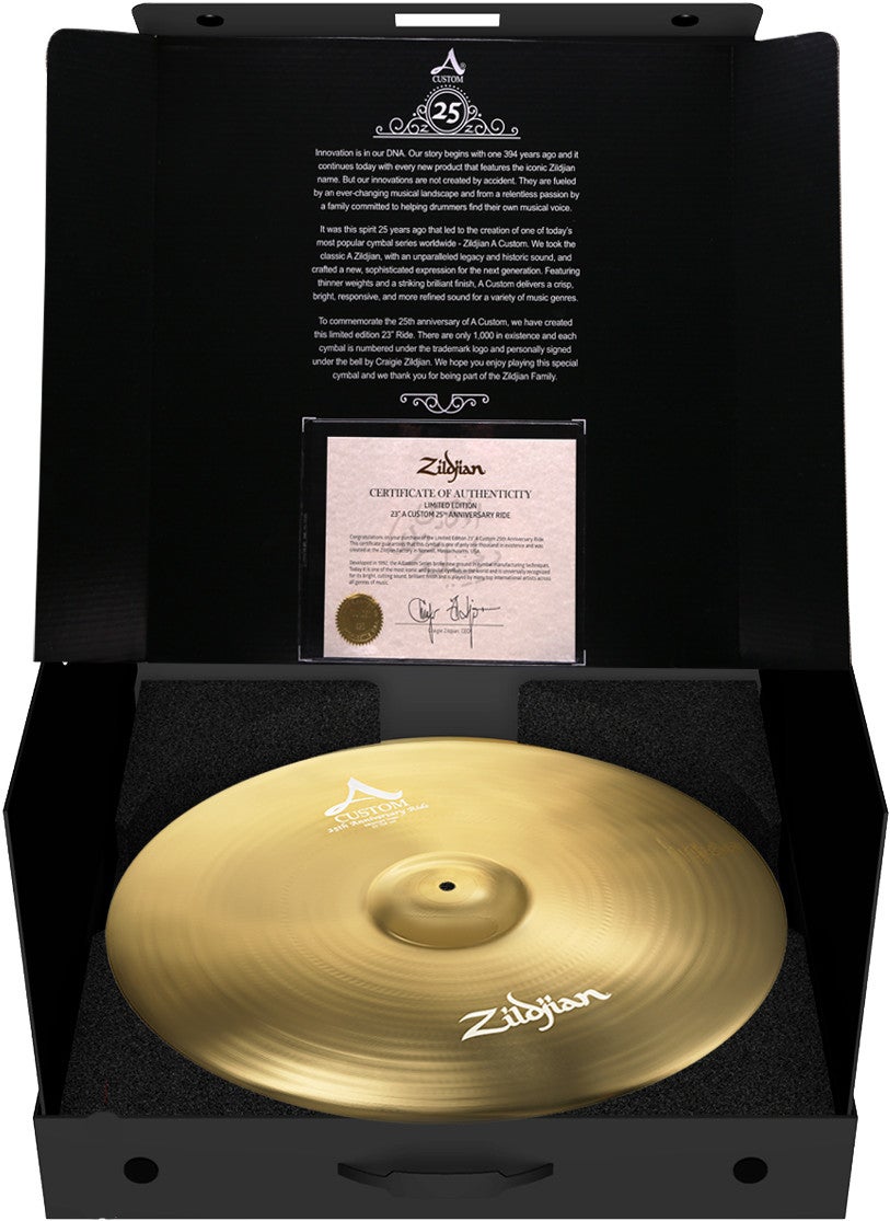Cette nouvelle ride est fabriquée en édition limitée à 1000 exemplaires - ce qui est peu pour une cymbale Zildjian. Chaque exemplaire de cette ride de 23 pouces A Custom est numéroté (de 1 à 1000), ce qui ravira les collectionneurs. De plus, ces rides sont toutes signées par Craigie Zildjian en personne. Pour l'occasion, elles arborent le logo A Custom en blanc et une inscription « 25th Anniversary » est gravée au laser. Notez enfin que ces cymbales Ziljdian sont livrées dans une boîte « 25th Anniversary » avec leur certificat d'authenticité.