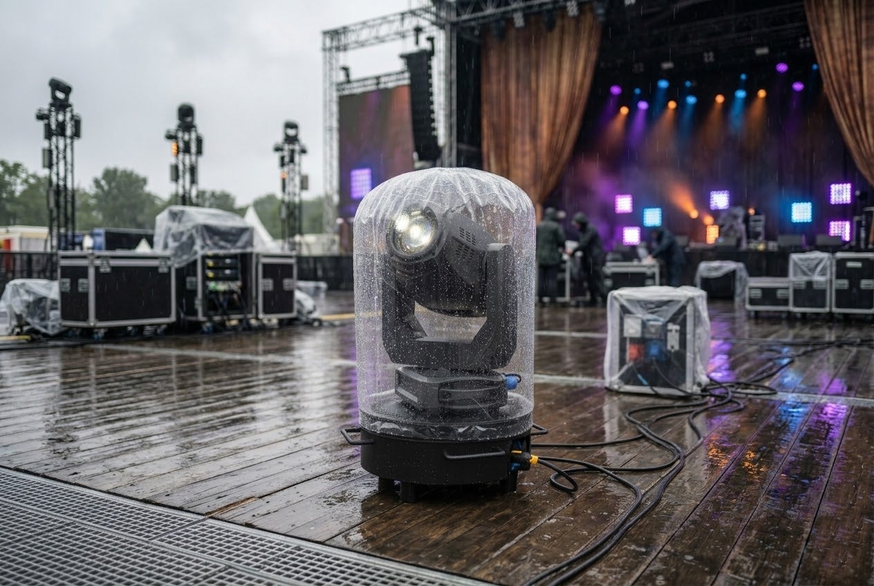 L’appareil lui-même rencontre également des difficultés avec ces protections transparentes. Une fois la lyre bien emballée et allumée, des problèmes d’accumulation de chaleur surviennent : la ventilation à l’intérieur d’un dôme est rarement idéale. Visuellement, le résultat est souvent décevant. Une scène au design soigné avec une structure imposante perd son charme industriel lorsque des housses en plastique flottent un peu partout. De plus, la condensation et les gouttes de pluie sur le plastique nuisent à la netteté de vos faisceaux lumineux. Et le risque le plus important : si vous décidez d’installer un projecteur standard (non-IP) à l’extérieur sans protection et qu’il tombe en panne à cause de l’humidité, vous pouvez faire une croix sur votre garantie. Vous ignorez en effet le mode d’emploi qui préconise une utilisation en intérieur.
