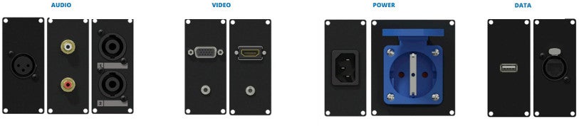 Les modules se déclinent eux aussi en différentes versions. Sur les modules audio vous pouvez brancher des micros, des appareils de niveau ligne et des enceintes. Les modules vidéo sont munis de connecteurs VGA et HDMI et les modules Power proposent des connecteurs d'alimentation Euro et Schuko. Les modules Data, pour finir, sont pourvus de ports USB et de connecteurs Ethercon.
