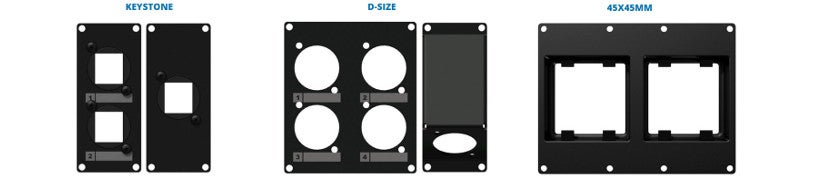 De plus, il existe des modules avec des trous pré-percés pour les connecteurs de taille D, des modules avec des trous 45 x 45 mm pour les matrices ou contrôleurs de volume et des modules avec des trous pour les connecteurs Keystone. Ces derniers sont fabriqués par Procab.